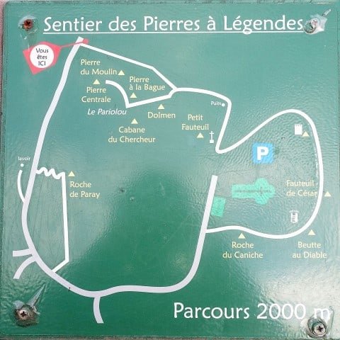 Bovenaan de heuvel, dichtbij het beeld van Maria, vind je een kleine groene wegwijzer met de tekst ‘ Chemin des Pierres à Légendes’. Dit is een begin van een route die je langs verschillende van deze granieten voert.