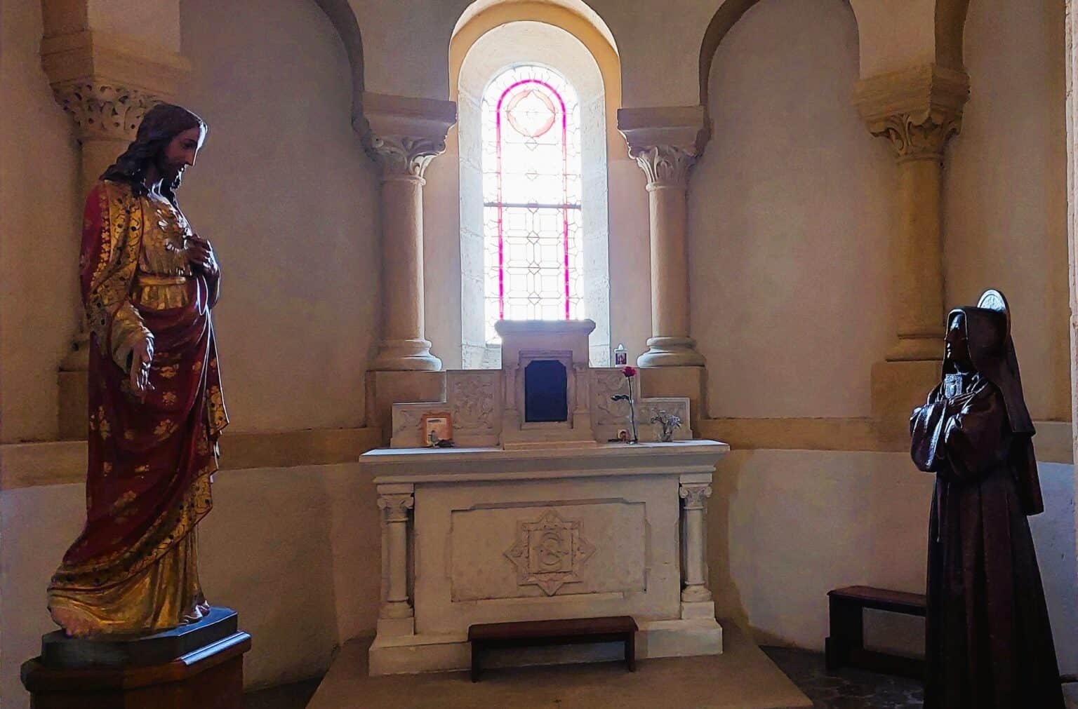 Van dezelfde kunstenaar is het houten beeld van sainte Marguerite-Marie Alacoque. Dit kom je tegen in de kooromgang. Sainte Marguerite-Marie aanschouwt vanaf haar plaats het Heilig Hart van Jezus. Wat ook de naam van de kerk verklaart.